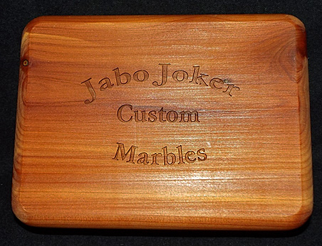 This custom made 24 count “Jabo Joker Custom Marbles” solid aromatic cedar “Modern Design” display case includes paper liners behind the two 24 count foam pads. The corners have magnets to help secure your marbles when the case is not open for viewing. The top is laser engraved with the logo, “Jabo Joker Custom Marbles”. You can store marbles from 11/16″ to 3/4″. We are very proud to say that the display case is manufactured in the USA. The overall dimensions on the case are L-6″, H-2″, W-4-1/2″. Please email any questions. USPS shipping.